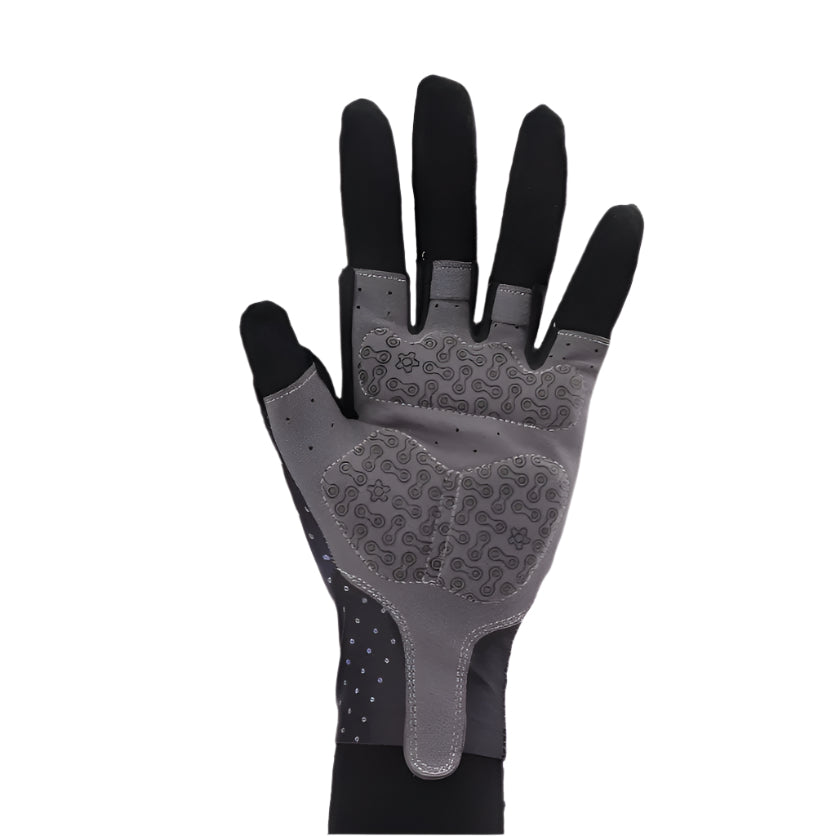 - Palma reforzada con carbono: la palma con textura de carbono ultraliviana y duradera proporciona un agarre y control superiores en el manillar, incluso en condiciones húmedas.