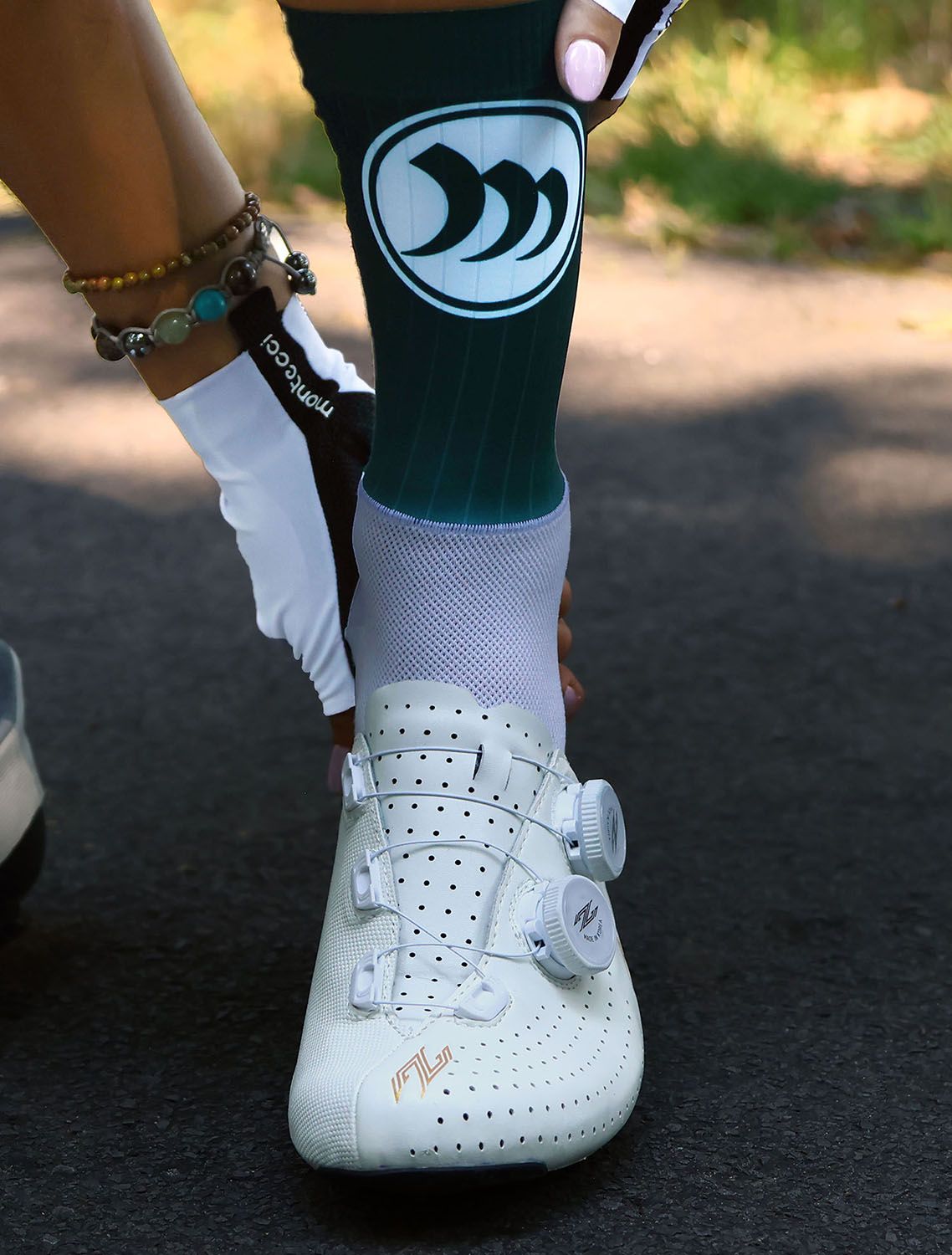 The upper section features a trip-line textured aero fabric, strategically structured to disrupt airflow and reduce drag across the lower leg. This design mimics the surface manipulation used in elite race suits and is fully printed with Montecci’s signature graphic detail. The lower section is constructed from a breathable knit, offering support, ventilation, and comfort for the foot throughout long efforts.